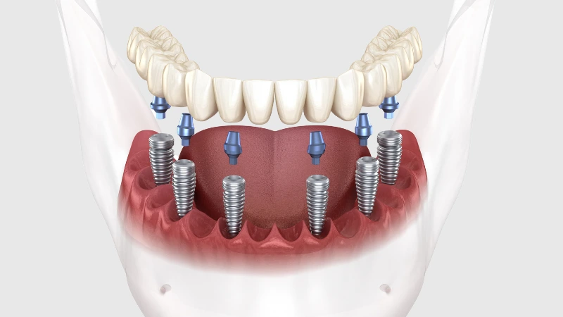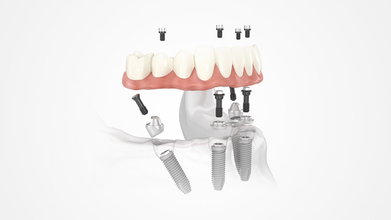Vier Zahnimplantate (Titanschrauben) werden chirurgisch in den Kieferknochen eingesetzt. Zwei Implantate werden an der Vorderseite des Kiefers eingesetzt, und zwei werden schräg im hinteren Bereich platziert, um die Knochenunterstützung zu maximieren. Eine feste Prothesenbrücke (ein vollständiges Set künstlicher Zähne) wird dann an diese Implantate befestigt.